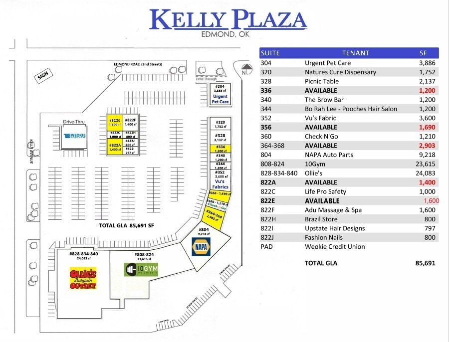 Kelly Plaza 800-828 W Edmond Rd 1,200 - 8,793 SF of Retail Space Available in Edmond, OK 73003